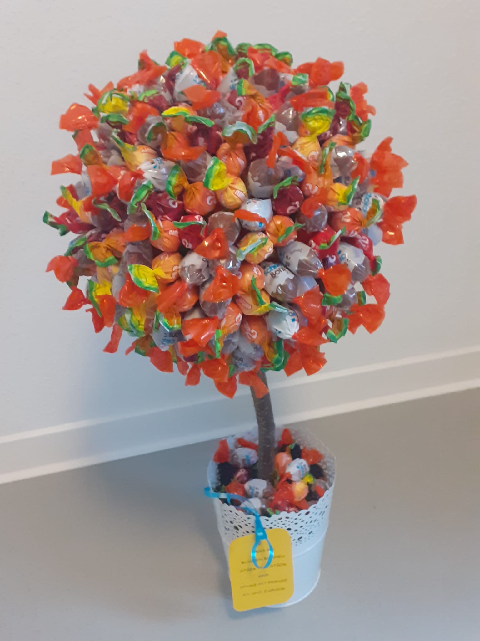 Die Kanne wurde mit einzelnen Fingerabdrücke der Klienten:innen gestaltet und der Baum besteht aus ganz vielen Bonbons.